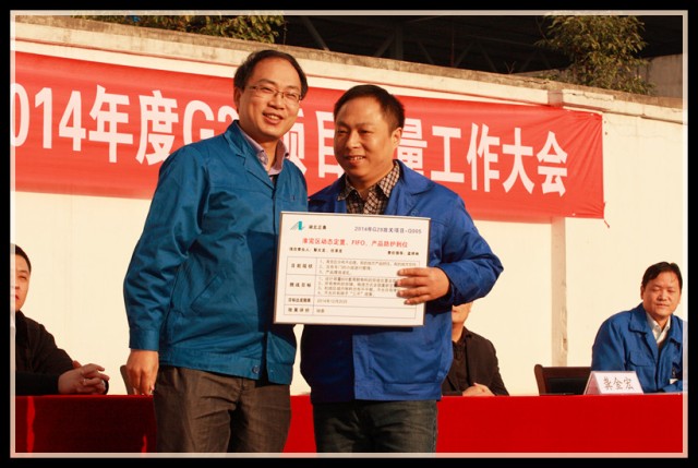 到會(huì)領(lǐng)導(dǎo)為G29項(xiàng)目組成員頒發(fā)了戰(zhàn)表,為下一階段的改善制定新的挑戰(zhàn)目標(biāo),全體員工見證了這一重要時(shí)刻,并在會(huì)議現(xiàn)場(chǎng)用熱烈的掌聲表達(dá)了完成任務(wù)的信心和決心。